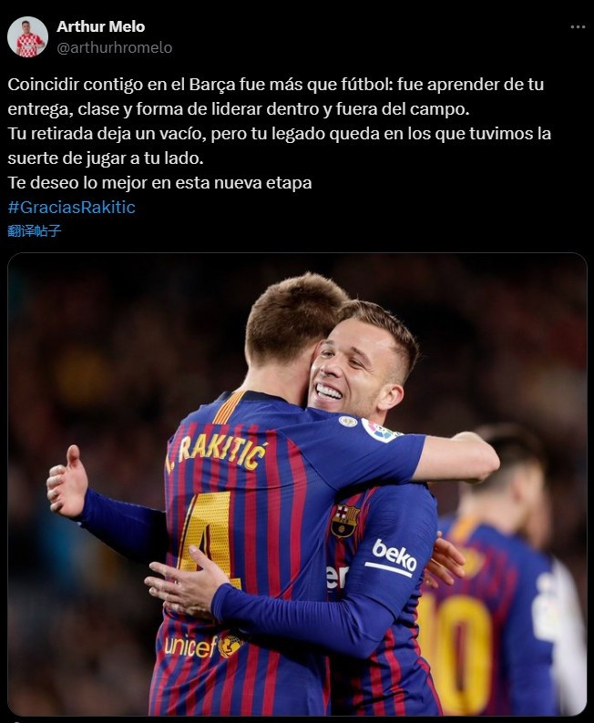 直播吧7月8日讯在前巴萨中场拉基蒂奇宣布退役后,他在巴萨的前队友、目前在尤文效力的阿图尔也为他送上了祝福。